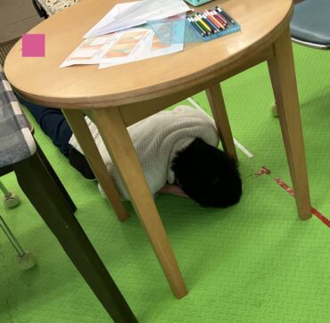ダンゴムシのポーズで頭を守り上手に机やテーブルの下に隠れます。