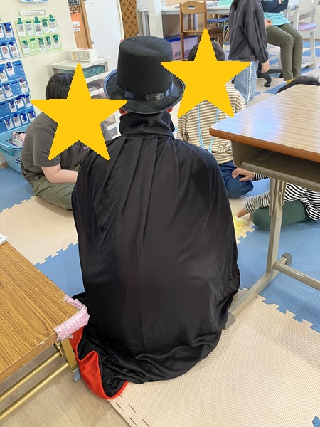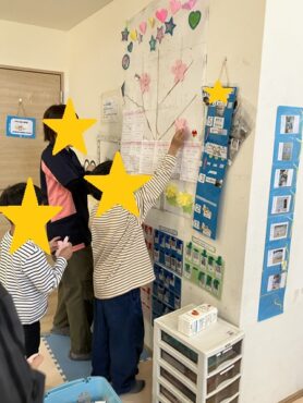 壁面に飾りつけると、先生から進級祝い
